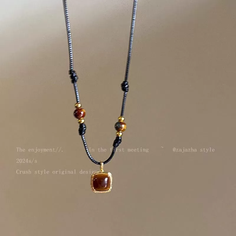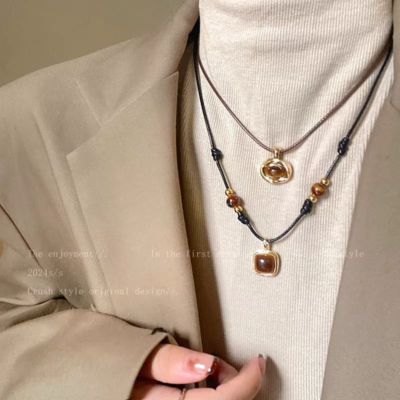 Tiger eye stone braided leather rope necklace autumn and winter 2024 Yadan new hot style sweater retro style matching